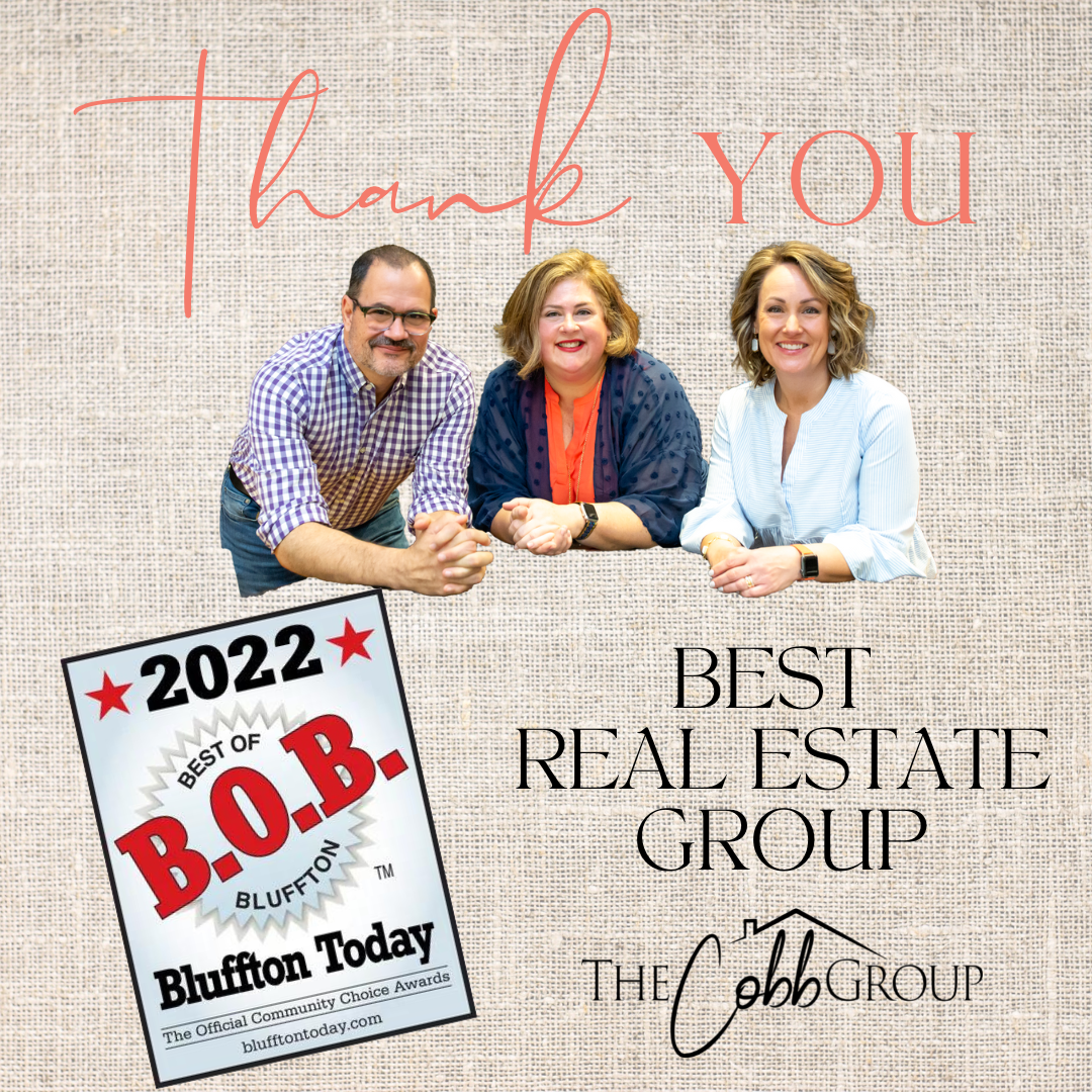 The Cobb Group, a Charter One Realty team, comprised of Allison Cobb, David Hussey and Natalie Burnside is over the moon to be awarded Best Real Estate Team in Bluffton for 2022. They beat out many other top real estate teams making this an even bigger honor. The Cobb Group has been blessed with multiple wins in the past with the Best of Bluffton for Allison Cobb as Best Realtor, but to win as the Best Real Estate Team in Bluffton is a huge accomplishment. It is refreshing for a team to win that puts in the effort and energy to keep their clients coming back time and time again. Referrals and 5-star reviews are the greatest compliments, and there is no shortage of these when it comes to The Cobb Group. Hard work, high integrity and professionalism are all…