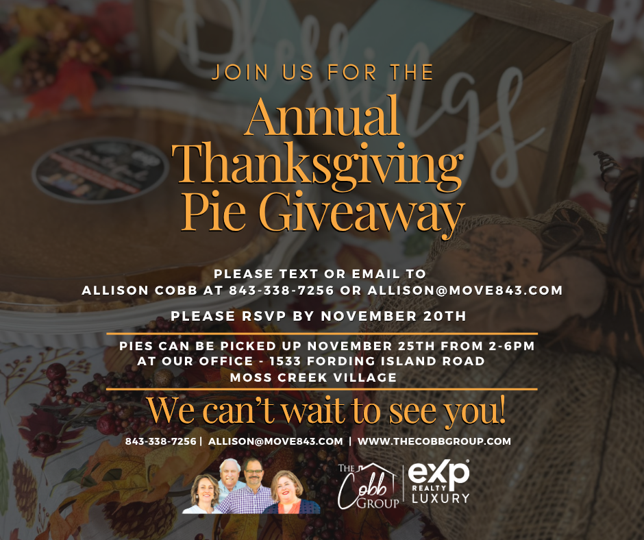 Thanksgiving season is officially here—and in Moss Creek, that means one of our favorite traditions is back. On Tuesday, November 25th, The Cobb Group is hosting our annual Thanksgiving Pie Pickup Event, where clients, friends, neighbors, and local homeowners can swing by our Moss Creek Village office and pick up a complimentary pumpkin pie as our way of saying thank you.
