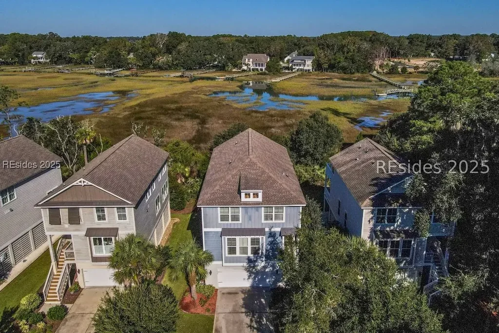 Extraordinary Marshfront and Waterfront views on Old House Creek meets its match with this beautiful 4 bedroom, 3.5 bathroom home featuring multiple primary bedrooms, 6-foot bump out of extra living room space, added outdoor patio space, two screened in porches, elevated living, 4 car garage plus extra room for storage, ample storage closets, kitchen cabinets galore, day dock and boat storage, and the list goes on. Located in the gated Salt Creek Landing Community on Spanish Wells Road, a convenient mid island location with quick access to Highway 278 and the Cross Island Parkway. This home meets all your needs!